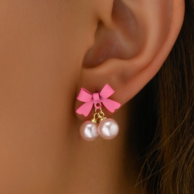 Bow Pearl Stud Earrings for Women - Minimalist Geometric Pink Jewelry