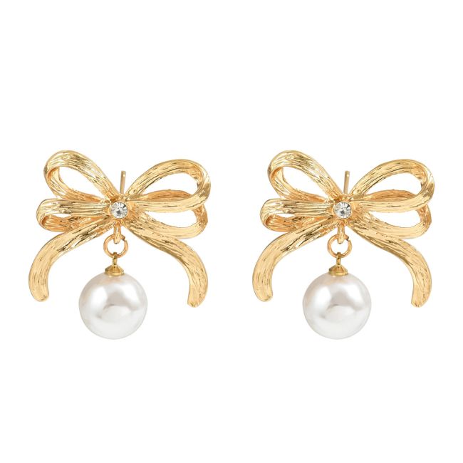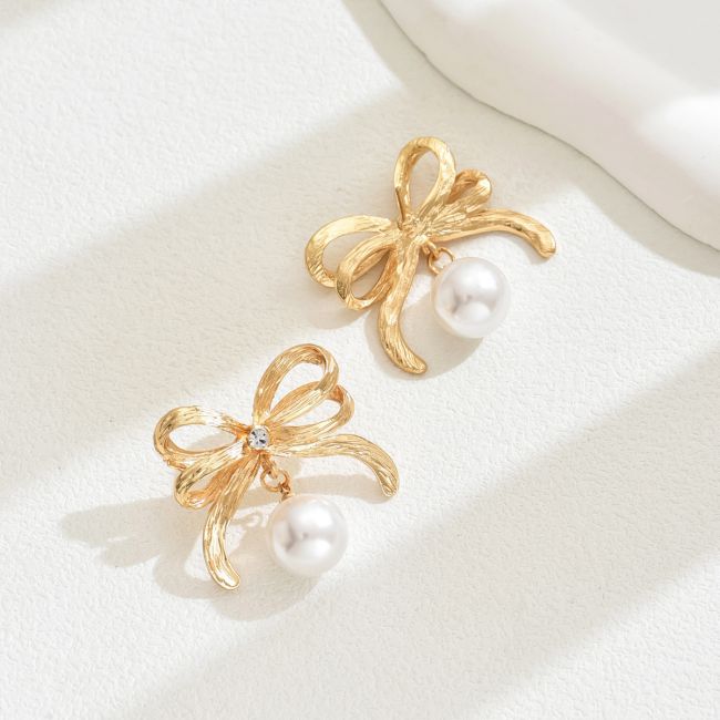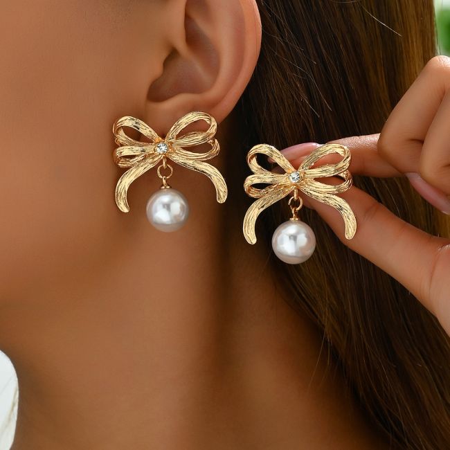 Bow-Shaped Pearl Stud Earrings with Geometric Design for Women
