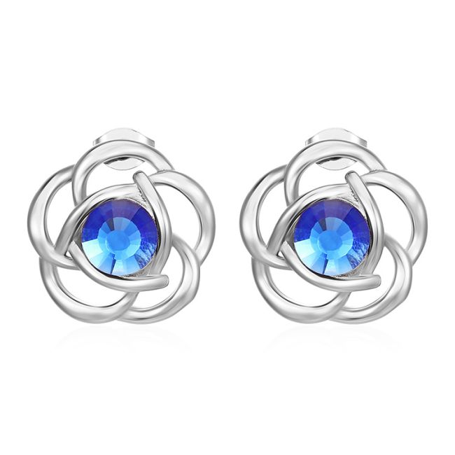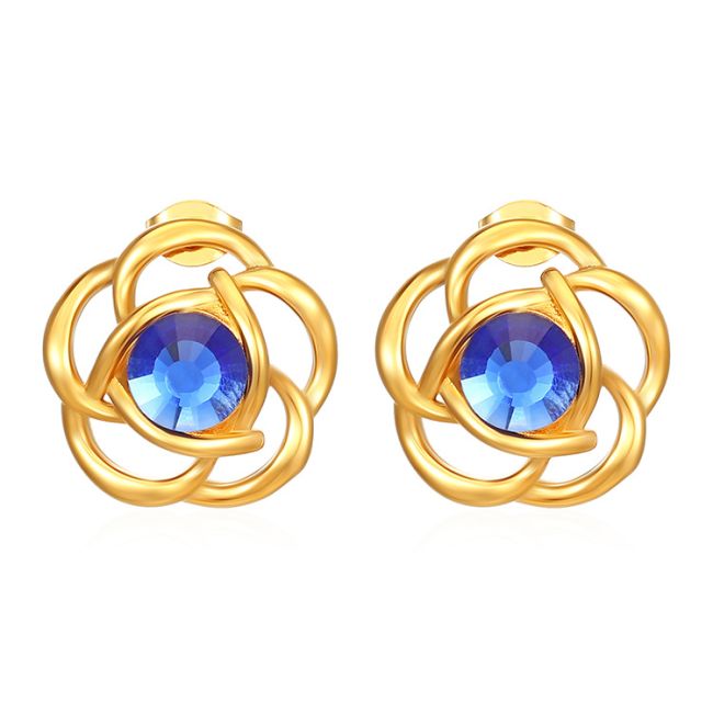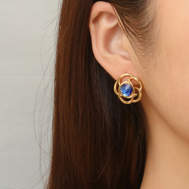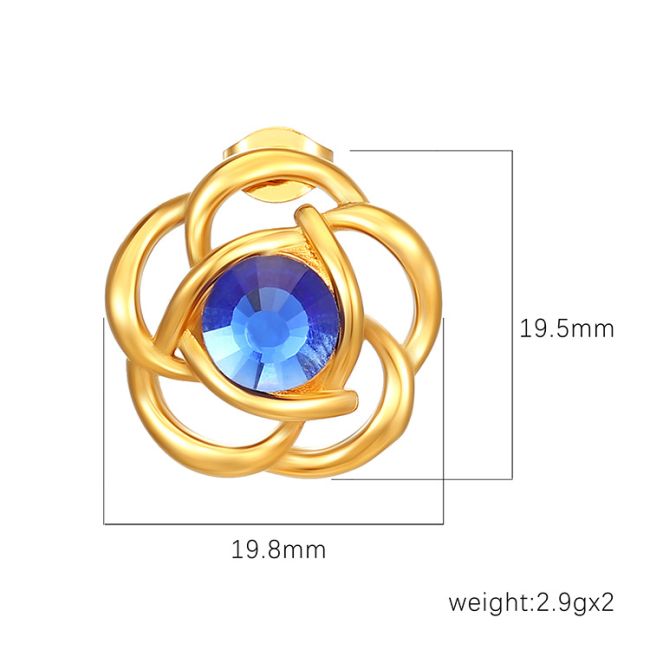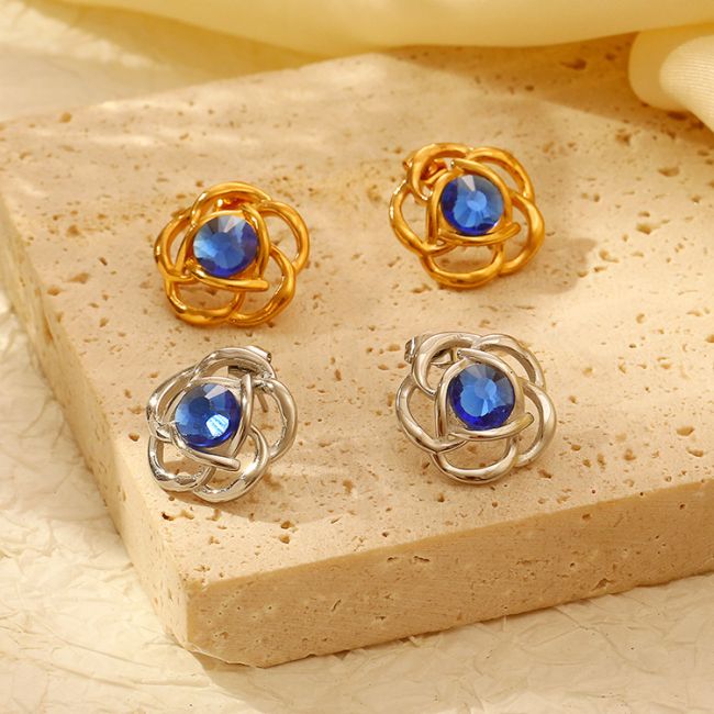 Floral Stainless Steel Diamond Earrings for Women - Elegant Camellia Blue Diamond Studs in Gold and Silver Tones
