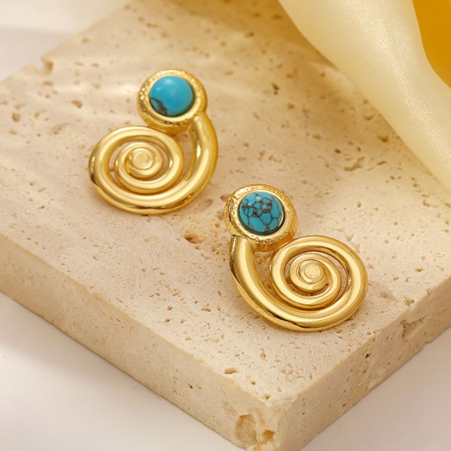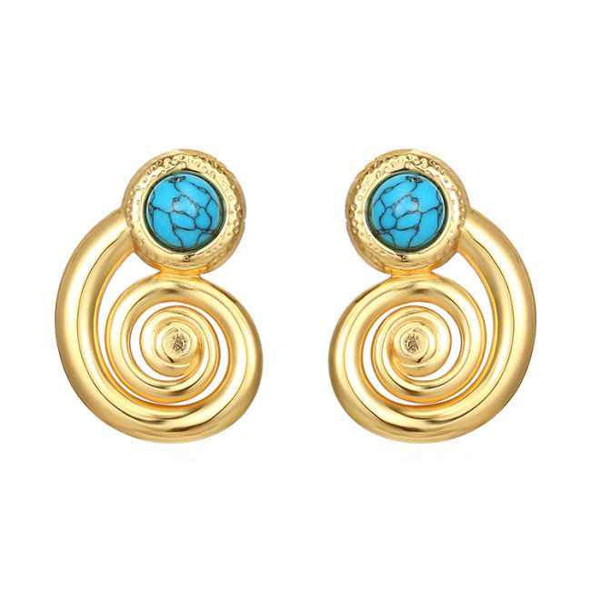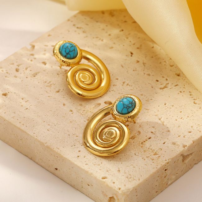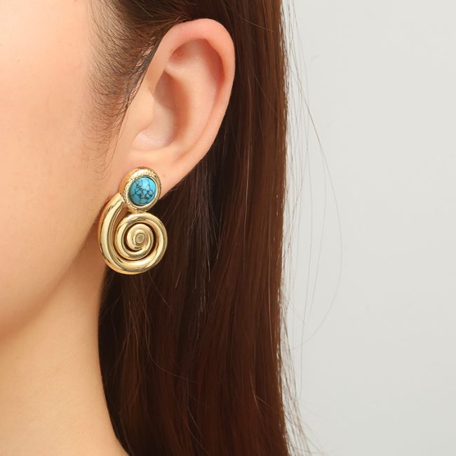 French Vintage-Inspired 18K Gold Plated Stainless Steel Spiral Hoop Earrings with Natural Stone Accents