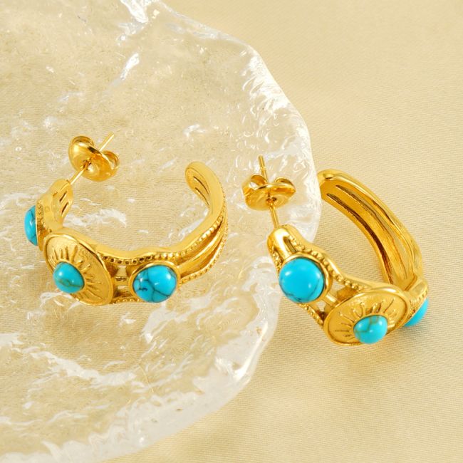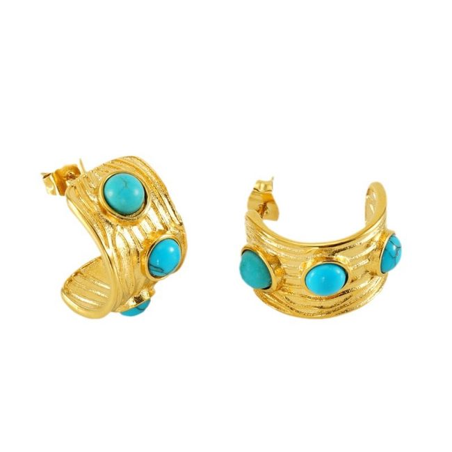 French Vintage Style Geometric Earrings with Blue Turquoise Inlay and Textured Finish