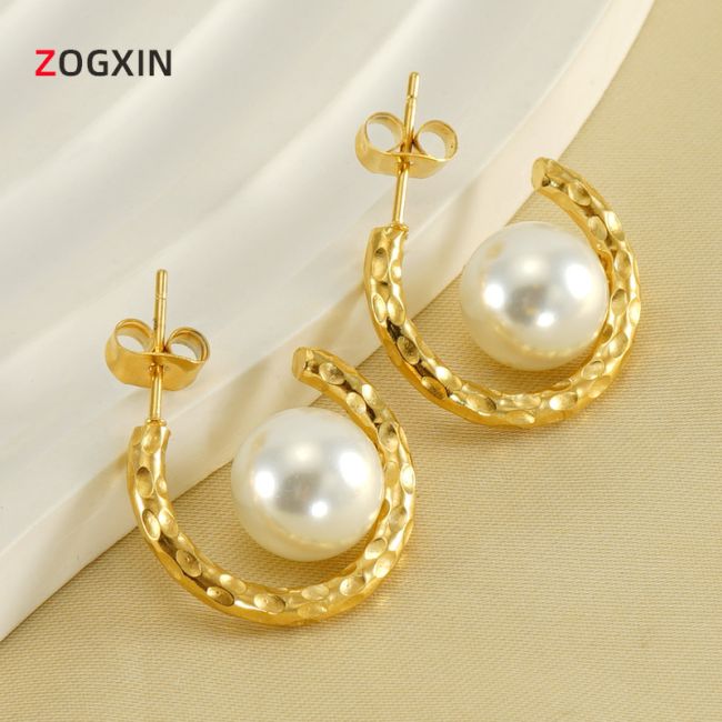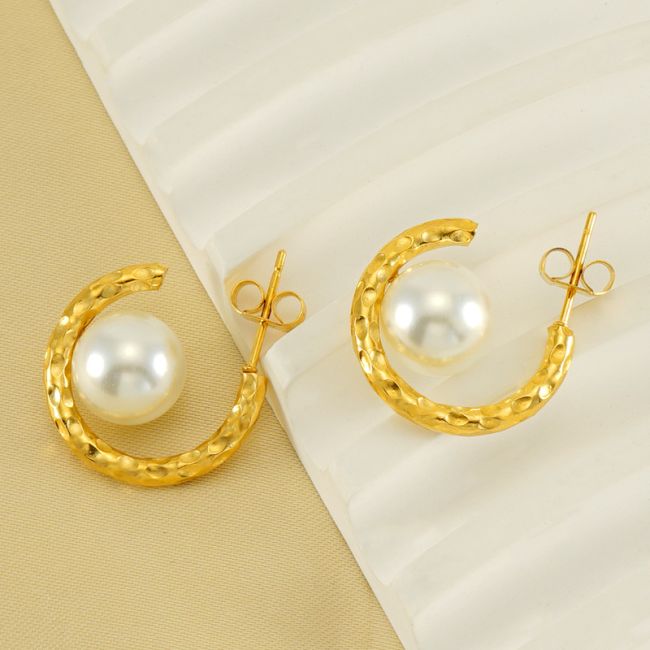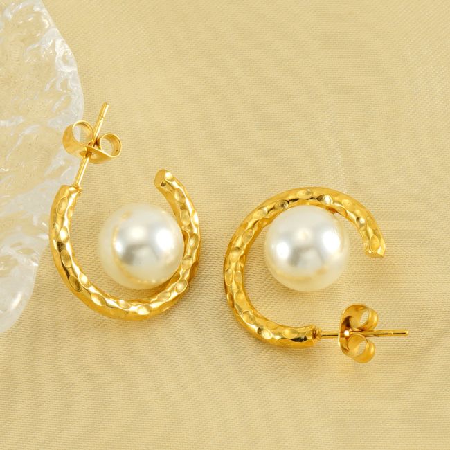 Geometric C-Shaped Stainless Steel Pearl Earrings for Women