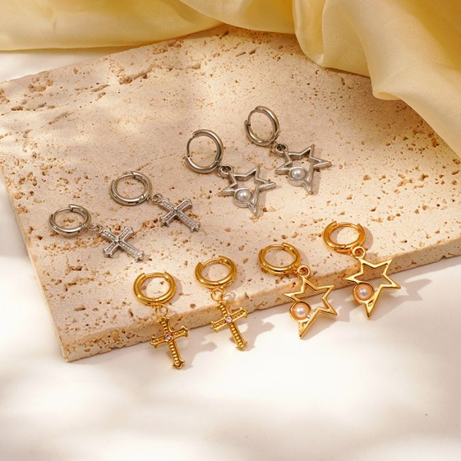 Geometric Cross and Star Drop Earrings for Women - 18K Gold Plated Stainless Steel Fashion Statement