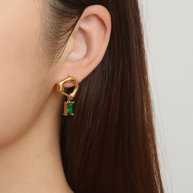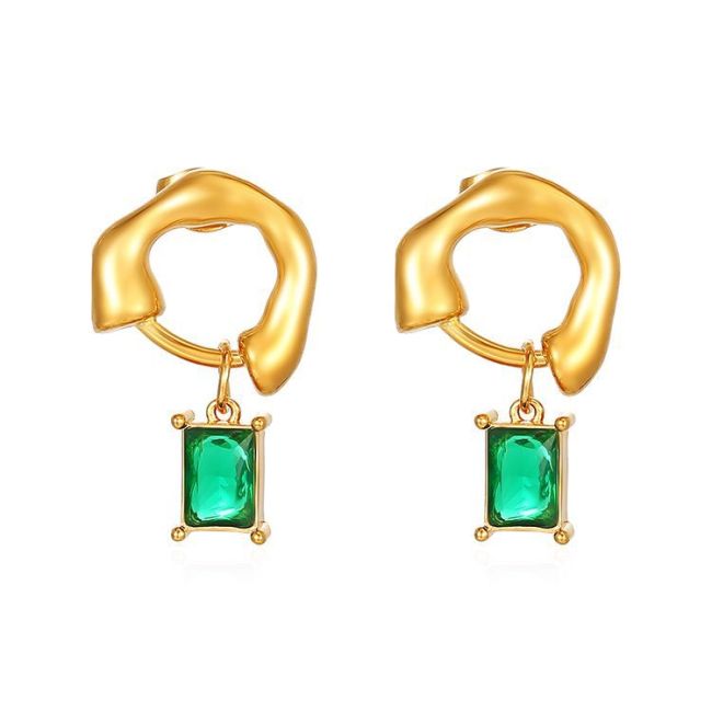 Geometric Square Stainless Steel Green Crystal Drop Earrings for Women - Retro Luxury Style
