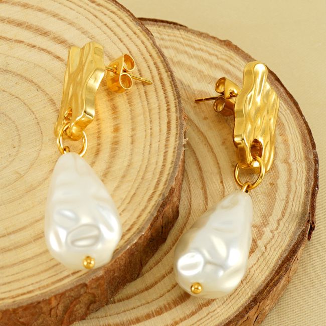Pearl Drop Earrings with Irregular Geometric Design in 18K Gold Plated Stainless Steel