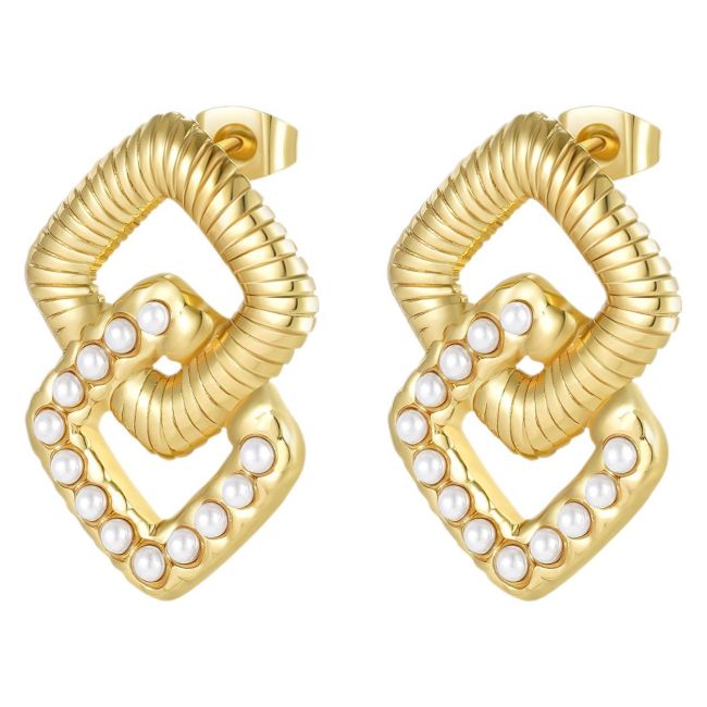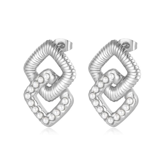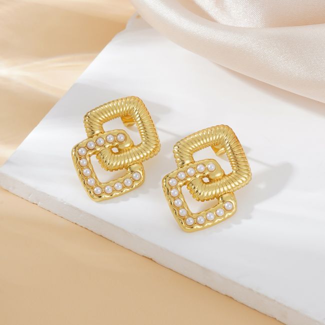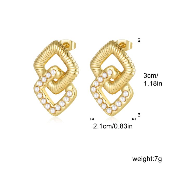 Square Double-Layer Stainless Steel Pearl Earrings for Women - Modern Geometric Design