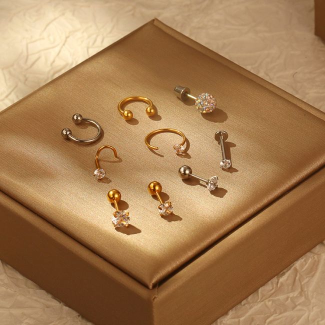 - Set includes: Nose rings, ear studs, lip stud, and cartilage jewelry