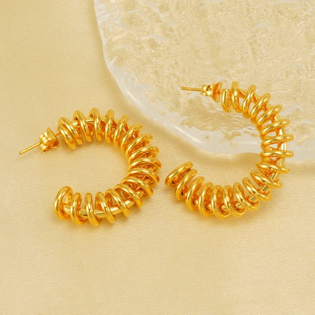 Material: High-quality stainless steel with 18K gold platingColor: Elegant gold finishDesign: Geometric spring hoop with vintage-inspired detailsStyle: Fashion-forward and suitable for daily wearCraftsmanship: Electroplated for long-lasting color retentionOccasion: Perfect for both casual and formal settingsMatching: Pairs well with minimalist or statement jewelryFeature: Lightweight and comfortable for all-day wear