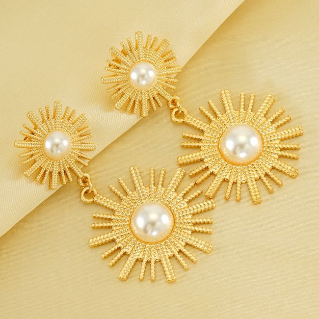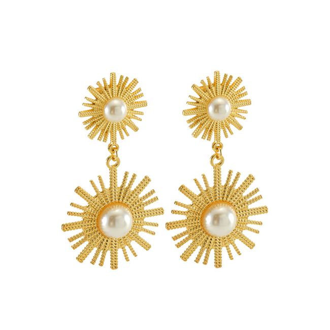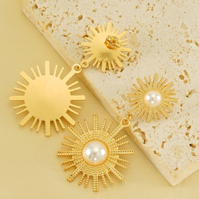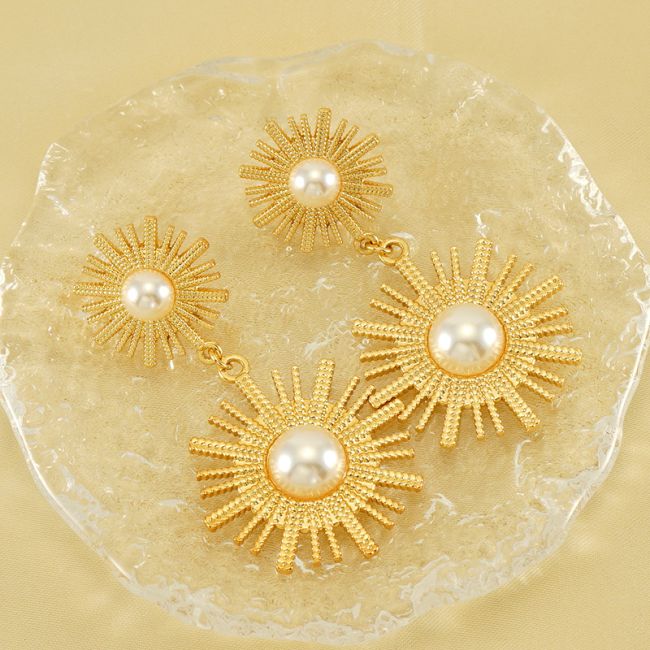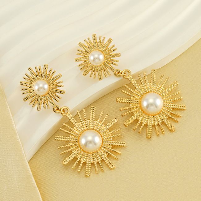 Vintage Round Sunflower Pearl Earrings - 18K Gold Plated Stainless Steel Studs for Women